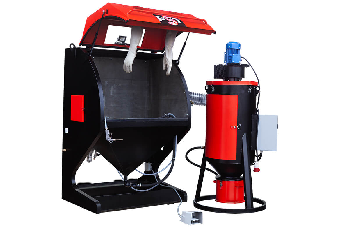 Абразивоструйные камеры бывают инжекторного и напорного типа. В камерах инжекторного типа — воздух и абразив подаются по двум разным рукавам. Воздух по рукаву подается непосредственно в соплодержатель, в котором установлены два сопла: абразивоструйное и воздушное. Между соплами создается разряжение, за счет которого происходит подсос абразива. Скорость и энергия воздушно-абразивной струи при инжекторном типе значительно ниже, чем в напорном, что удовлетворяет при небольших объемах работ. В камерах напорного типа — абразив и сжатый воздух подаются по одному рукаву, на конце которого крепится абразивоструйное сопло для придания формы и направления струи. Скорость и энергия воздушно-абразивной струи при напорном типе высока, что позволяет выполнять большие объемы работ и производить глубокую очистку поверхности. Основными преимуществами таких камер являются: минимальная запыленность, рециркуляция абразива, большое количество исполнений и дополнительных опций. В качестве опций возможно изготовление поворотного стола, устройства перемещения сопел и систем автоматизации процесса.